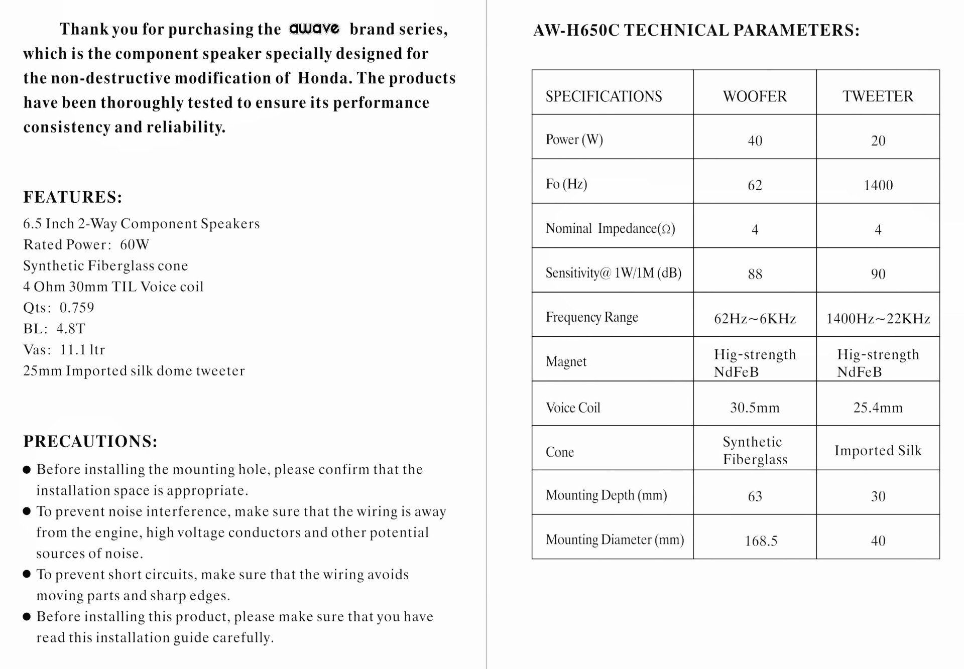 - Qts:0.759 / BL:4.8T / Vas:11,1 L / fs: 62 Hz